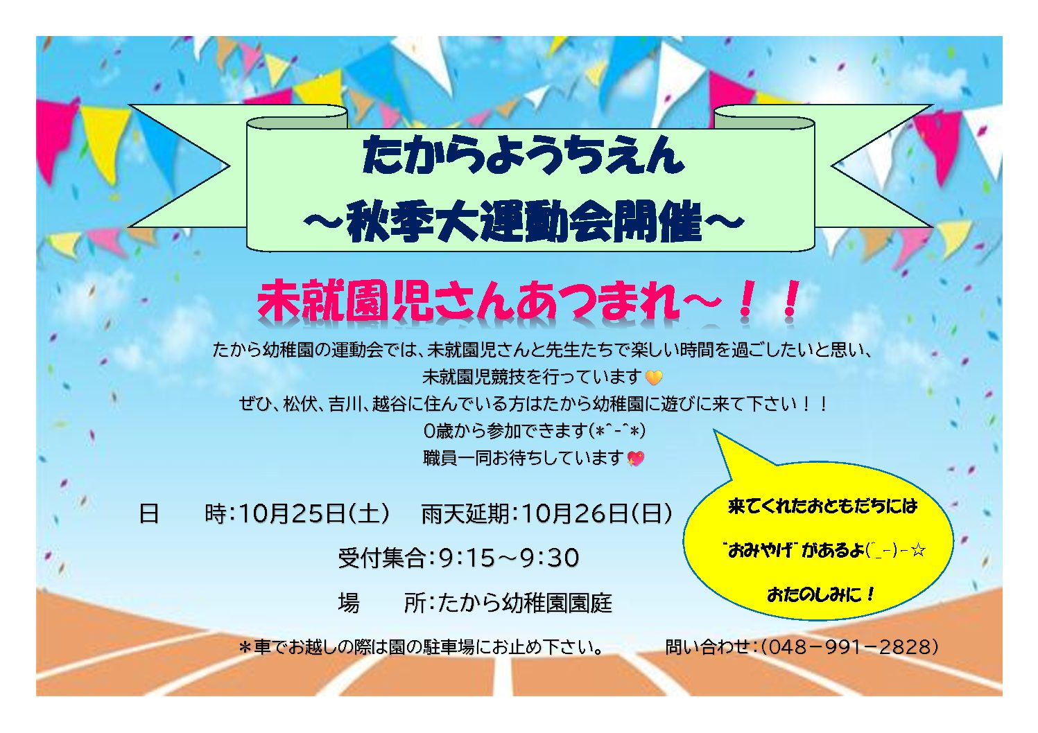 令和7年10月25日(土)【雨天:10月26日(日)】に、たから幼稚園「秋季大運動会」を開催致します。今年度も、未入園児のお子様と親子でご参加頂ける競技があります。受付は9:15~9:30にて行いますので、是非、遊びに来て下さい。幼稚園の先生とお友だちでお待ちしております。又、当日は沢山の方の来場が予想されております。競技に参加される方で、松伏町内お近くにお住いの方は、大変申し訳ございませんが「徒歩・又は自転車での来園」にご協力お願い致します。。※天候等により開催日時が変更の際には、ホームページにてお知らせ致します。不明な点は、園までお問い合わせ下さい。048-991-2828