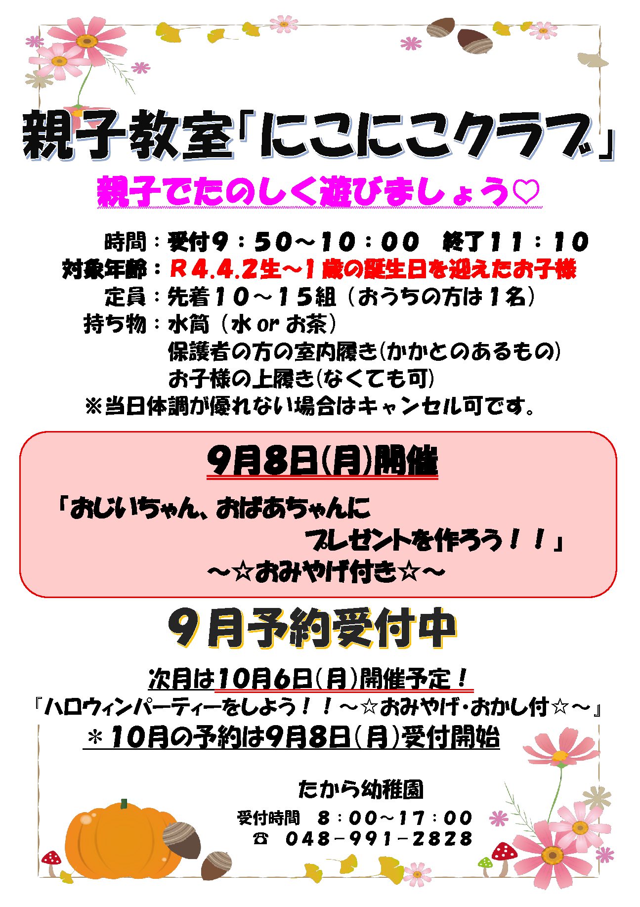 親子教室「にこにこクラブ」9月開催日についてお知らせ致します。たから幼稚園では1.2.3歳児のお友達を対象に楽しい遊びを行っております。定員先着10組となっておりますので予約をお願い致します。是非遊びに来てくださいね!!たから幼稚園048-991-2828(受付8:00~17:00)