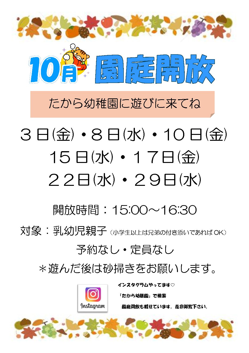 10月の園庭開放日は表記の通りです。開放時間は15:00~16:00となっております。お帰りの際は、掃き掃除にご協力をお願い致します。ご不明な点につきましては、お声かけ下さい。