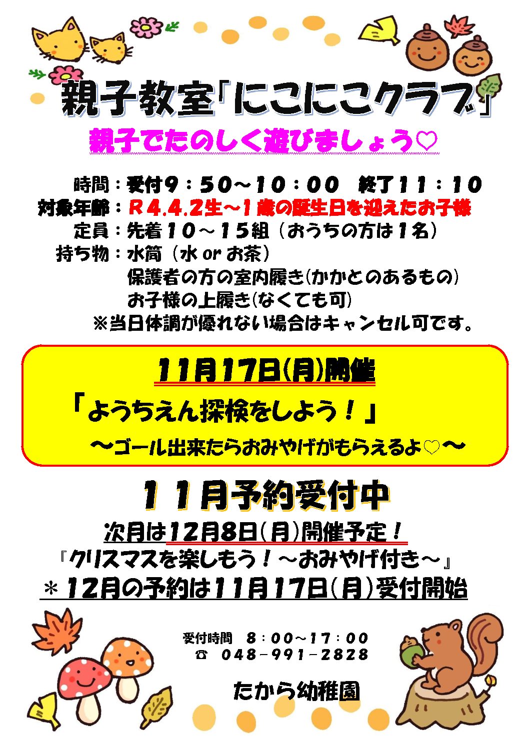 親子教室「にこにこクラブ」11月の開催日についてお知らせ致します。たから幼稚園では1.2.3歳児のお友達を対象に楽しい遊びを行っております。定員先着10組となっておりますので電話にて予約をお願い致します。次回は幼稚園探検をしますよ★是非遊びに来てくださいね!!たから幼稚園048-991-2828(受付8:00~17:00)