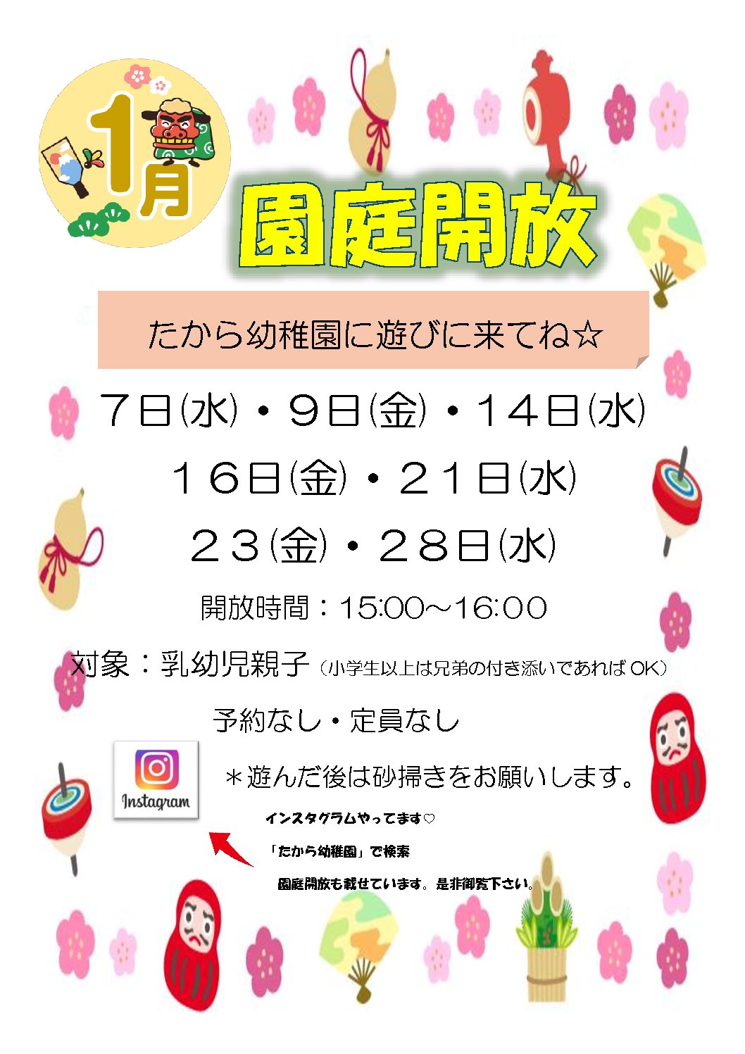 1月の園庭開放日は表記の通りです。開放時間は15:00~16:00となっております。お帰りの際は、掃き掃除にご協力をお願い致します。ご不明な点につきましては、お声かけ下さい。