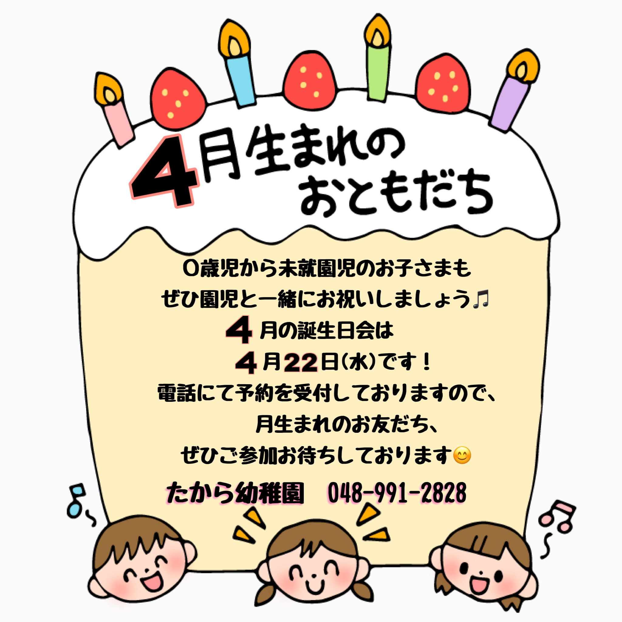 未入園児のお子さんで4月生まれの方はどなたでも参加頂けますので、ご参加をご希望される方は事前に当園迄ご連絡をお願い致します。詳細については下記の通りです。※5分前までにお越し下さい。終了予定時刻は11:30頃です。お不明な点がございましたら。当園迄ご連絡下さい。